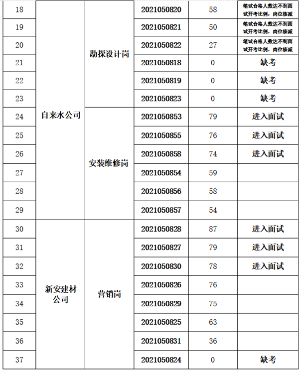 根据《星空体育·(中国)官方网站-登录入口下属子公司招聘员工考试公告》,笔试工作已于2021年5月9日上午结束,现将笔试成绩及进入面试人员名单公布如下: